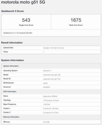 Motorola Moto G51 स्पेसिफिकेशन्स (Geekbench)