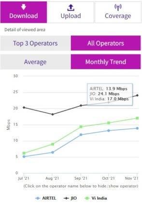 रिलायंस जियो से पिछड़ने के बावजूद, एयरटेल ने 13.9 एमबीपीएस 4जी डाउनलोड स्पीड दर्ज की है। अक्टूबर के मुकाबले उसकी स्पीड में 0.7 एमबीपीएस की मामूली बढ़ोत्तरी हुई। एयरटेल लगातार पिछले कई महीनों से तीसरे नंबर पर बना हुआ है। वोडाफोन और आइडिया सेल्युलर ने अपने कारोबार का विलय कर लिया था और अब वे वोडाफोन-आइडिया के रूप में काम कर रहे हैं पर अप्रैल 2021 तक ट्राई दोनों के आकंड़े अलग अलग दिखाता था। मई माह से ट्राई ने दोनों कंपनियों के आंकड़े वीआई इंडिया के नाम से प्रकाशित करने शुरू कर दिए हैं।