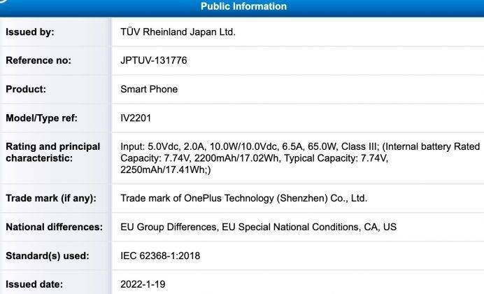OnePlus Nord CE 2 स्मार्टफोन 11 फरवरी को लॉन्च किया जा सकता है। TUV सर्टिफिकेशन से पता चलता है वनप्लस के इस स्मार्टफोन में 4450mAh की बैटरी दी जाएगी। इसके साथ ही TUV की लिस्टिंग से कंफर्म होता है कि फोन में 65W फास्ट चार्जिंग दिया जा सकता है।