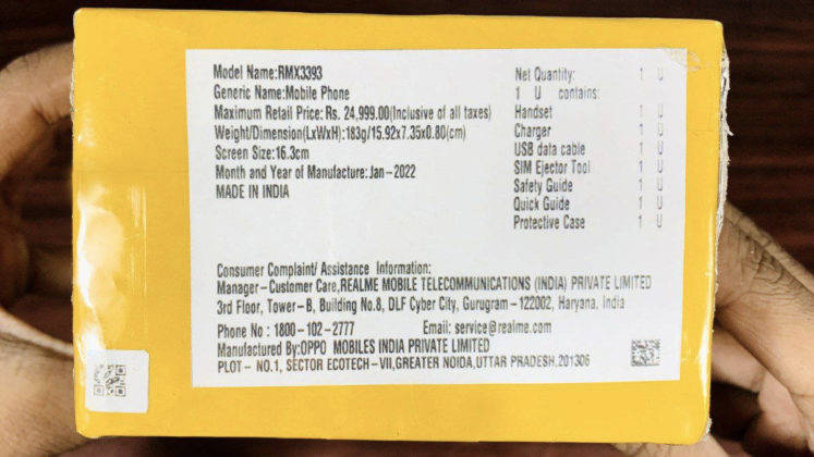 ताजा लीक में Realme 9 Pro 5G और Realme Pro Plus 5G के रिटेल बॉक्स की फोटो सामने आई है। इन रिटेल बॉक्स पर दोनों मोबाइल फोंस का प्राइस प्रिंट है। रियलमी 9 प्रो 5जी के बॉक्स पर जहां 18,999 रुपये प्राइस लिखा हुआ है वहीं रियलमी 9 प्रो प्लस 5जी फोन के रिटेल बॉक्स पर 24,999 कीमत छपी हुई है। रिटेल बॉक्स प्राइस को देखते हुए अनुमान लगाया जा रहा है कि Realme 9 Pro 5G फोन 16,999 रुपये और Realme Pro Plus 5G फोन 22,999 रुपये की कीमत पर भारत में लॉन्च हो सकता है।
