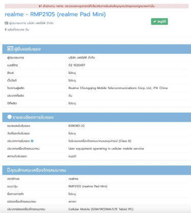 Realme Pad Mini (मॉडल नंबर Realme RMP2105) को थाईलैंड के NBTC सर्टिफिकेशन की वेबसाइट और इंडियन BIS सर्टिफिकेशन वेबसाइट में लिस्ट किया गया है। NBTC सर्टिफिकेशन से रियलमी के इस टैबलेट के मॉडल के बारे में पता चलता है। रियलमी के इस टैब के BIS में लिस्ट होने से पता चलता है कि यह जल्द भी भारत में भी लॉन्च किया जा सकता है। रियलमी के अपकमिंग टैबलेट के बारे में फ़िलहाल ज़्यादा जानकारी नहीं मिलती है।