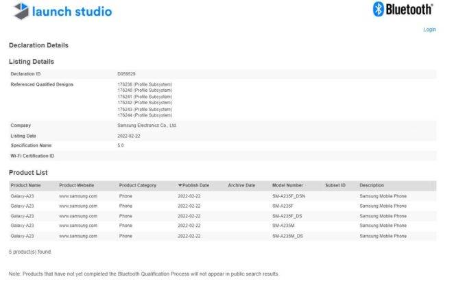 Samsung Galaxy A23 स्मार्टफोन जल्द लॉन्च होने वाला है। सैमसंग का यह स्मार्टफोन जल्द भी भारत और दूसरे इंटरनेशनल मार्केट में एंट्री करने वाला है। Samsung ने फिलहाल Galaxy A23 स्मार्टफोन के लॉन्च को लेकर ऑफिशियल ऐलान नहीं किया है। सैमसंग के इस बजट स्मार्टफोन को Bluetooth SIG सर्टिफिकेशन वेबसाइट पर लिस्ट किया गया है।