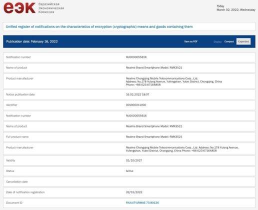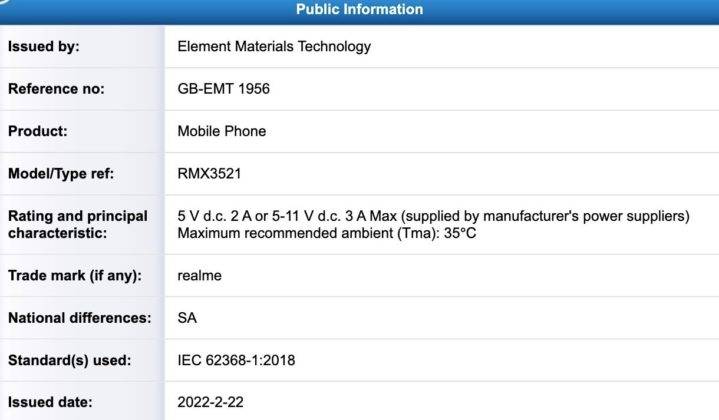Realme 9 4G स्मार्टफोन कई सर्टिफिकेशन एजेंसी जैसे FCC, EEC, EMT, BIS, और Thailand Telecom में लिस्ट किया गया है। इन सर्टिफिकेशन में रियलमी का यह स्मार्टफोन मॉडल नंबर RMX3521 के साथ लिस्ट गया है। रियलमी का यह मॉडल नंबर वाला स्मार्टफोन सबसे पहले नवंबर 2021 में स्पॉट किया गया था, तब इस स्मार्टफोन का मार्केटिंग नाम सामने नहीं आया था।
