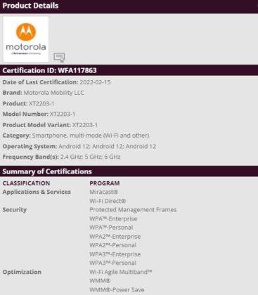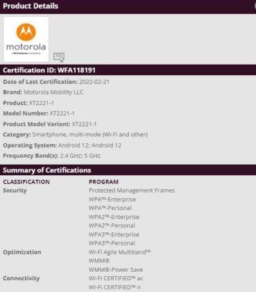 Motorola Edge 30 (XT2203-1) और Moto G52 (XT2221-1) स्मार्टफोन को Wi-Fi Alliance के डेटाबेस में स्पॉट किया गया है। मोटोरोला का यह स्मार्टफोन डुअल बैंड वाईफाई सपोर्ट और Android 12 के साथ मार्केट में उतारा जाएगा। इसके साथ ही Motorola Edge 30, Moto G52 और Moto E32 स्मार्टफोन को EEC में भी स्पॉट किया गया है। Moto E32 स्मार्टफोन Android 11 के साथ पेश किया जाएगा। यह भी पढ़ें : Vivo ने दिया होली का तोहफा, Vivo Y73, Vivo V21e और Vivo V21 स्मार्टफोन 2000 रुपये तक हुए सस्ते