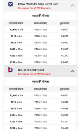 American Express Credit Card के अलावा दूसरे बैंक के कार्ड्स पर भी इस फोन को ईएमआई पर लिया जा सकता है। हालांकि, सभी बैंक द्वारा ब्याज की दर अलग-अलग होगी। वहीं, Amazon Pay ICICI Credit Card का ऑप्शन चुन कर बिना ब्याज दर के ईएमआई पर फोन खरीद सकते हैं। इस कार्ड के माध्यम से ग्राह कम से कम 783 रुपये की ईएमआई का चुनाव कर सकता है।