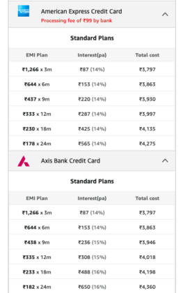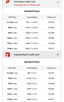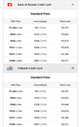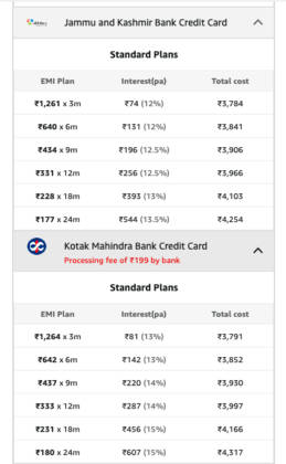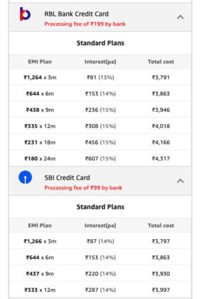 अगर आप अमेजन पे ICICI बैंक क्रेडिट कार्ड से फोन खरीदते हैं तो 618 रुपये की 6 EMI या 1237 रुपये की 3 EMI पर इसे खरीदा जा सकता है। वहीं, Bajaj Finserv के कार्ड से 1237 रुपये की 3 EMI पर इसे खरीदा जा सकता है।