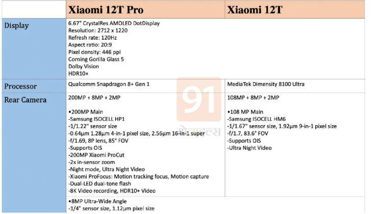 Xiaomi 12T Pro के स्पेसिफिकेशन