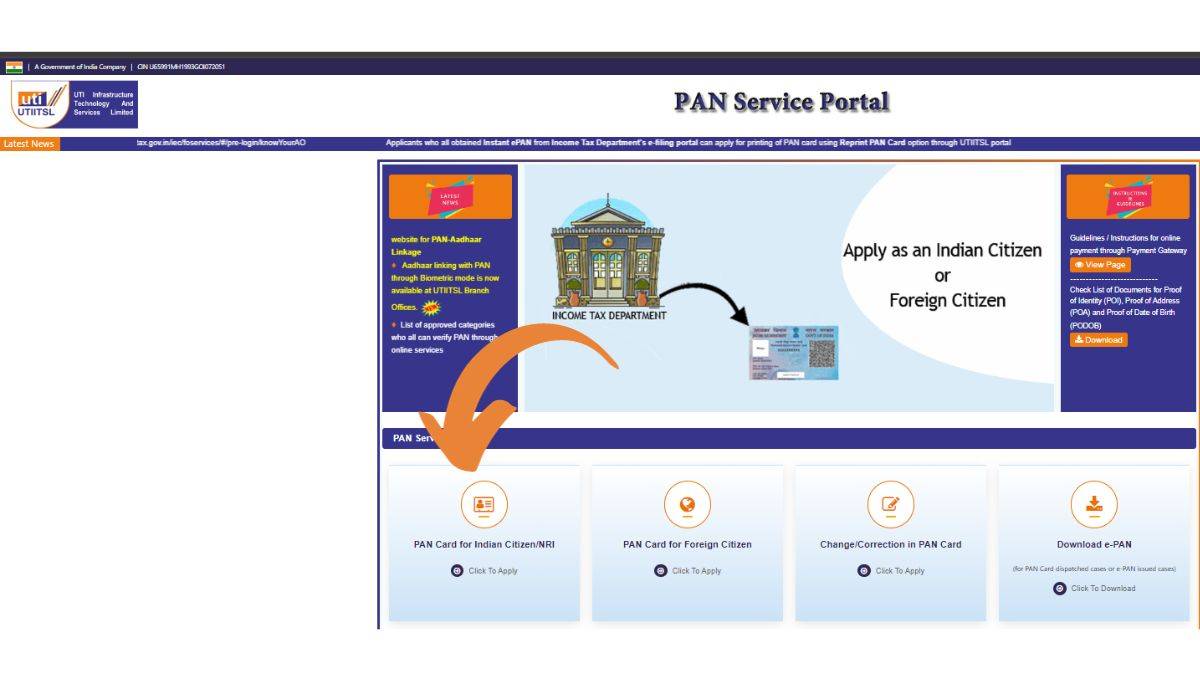 स्टेप 1: इसके लिए आपको UTIITSL PAN card एप्लीकेशन पेज पर जाना होगा। पैन सर्विसेज के अंतर्गत ‘PAN Card for Indian Citizen/NRI’ वाले ऑप्शन को सलेक्ट करना होगा।