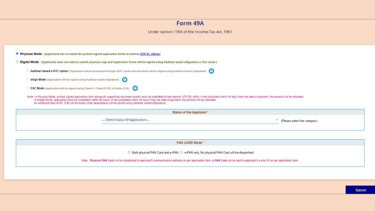 स्टेप 3: यहां पर आप ‘Physical Mode’ को चुनते हैं, तो फिर प्रिंटेड-साइन एप्लीकेशन फॉर्म को निकटतम यूटीआईआईटीएसएल कार्यालय में जमा करना होगा, वहीं अगर आप ‘Digital Mode’ का चयन करते हैं, तो फिर एप्लीकेशन फॉर्म पर डीएससी मोड का उपयोग करके या आधार आधारित ई-हस्ताक्षर का उपयोग करके सिग्नेचर किया जाएगा।