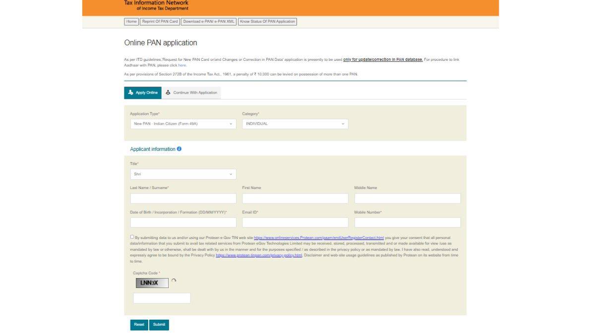स्टेप 2: फिर आपको ‘Apply for New PAN Card (Form 49A)’ वाले विकल्प पर क्लिक करना होगा। इसके बाद एप्लीकेशन पेज खुल जाएगा।