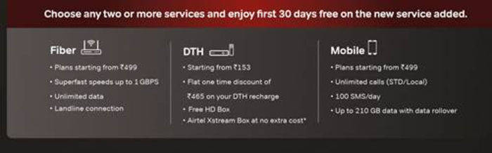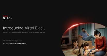 साथ ही एयरटेल ब्लैक ग्राहक भी अपनी जरूरत के हिसाब से प्लान्स को कस्टमाइज कर सकते हैं। वे कोई भी दो या अधिक सेवाएं चुन सकते हैं जैसे फाइबर (प्लान 499 रुपये से शुरू होते हैं, 1 जीबीपीएस तक की गति, असीमित डाटा और लैंडलाइन कनेक्शन), मोबाइल (प्लान 499 रुपये से शुरू होते हैं, असीमित कॉल, प्रति दिन 100 एसएमएस और 210 जीबी डेटा तक) रोलओवर के साथ), और डीटीएच (प्लान 153 रुपये से शुरू होते हैं, रिचार्ज पर फ्लैट 465 रुपये की छूट, मुफ्त एचडी बॉक्स और बिना किसी अतिरिक्त कीमत के एक्सस्ट्रीम बॉक्स)।