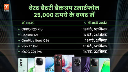 फोन को एक बार चार्ज करों और फिर पूरे दिन का झंझट ही खत्म। ऐसी चाहत लगभग हर स्मार्टफोन यूजर की होती है। अगर आप भी कोई लंबे बैटरी बैकअप वाला फोन ढूंढ रहें है तो आगे हमने मार्केट में मौजूद 5 नए और बेस्ट विकप्ल बताए हैं जिन्हें 25,000 रुपये के बजट में खरीदा जा सकता है। यहां दिए गए सभी मोबाइल्स को 91मोबाइल्स ने स्वयं टेस्ट किया है तथा इनका PCMark Battery Score, बैटरी ड्रॉप और चार्जिंग टाइम निकाला है।