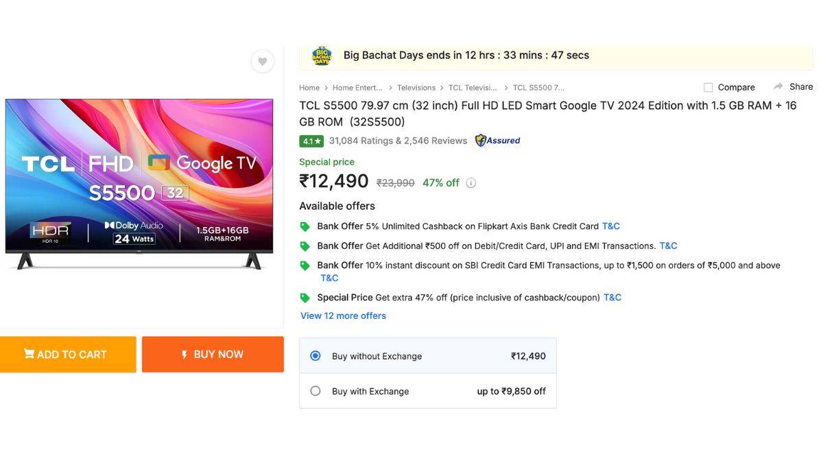 अगर आप नया टीवी खरीदने का प्लान कर रहे हैं, तो फ्लिपकार्ट पर इस समय Big Bachat Days सेल में TCL कंपनी के एक Smart TV को बेहद किफायती दामों में सेल के लिए उपलब्ध है। हम जिस टीवी के बारे में आपको बताने वाले हैं उसका मॉडल नबंर TCL S5500 79.97 cm (32 inch) Full HD LED Smart Google TV 2024 Edition है। यह टीवी उन ग्राहकों के लिए अच्छा है जो काफी लंबे समय से बड़ी स्क्रीन वाले टीवी की तलाश में हैं। आइए आगे आपको इस टीवी की डील के बारे में पूरी जानकारी देते हैं।