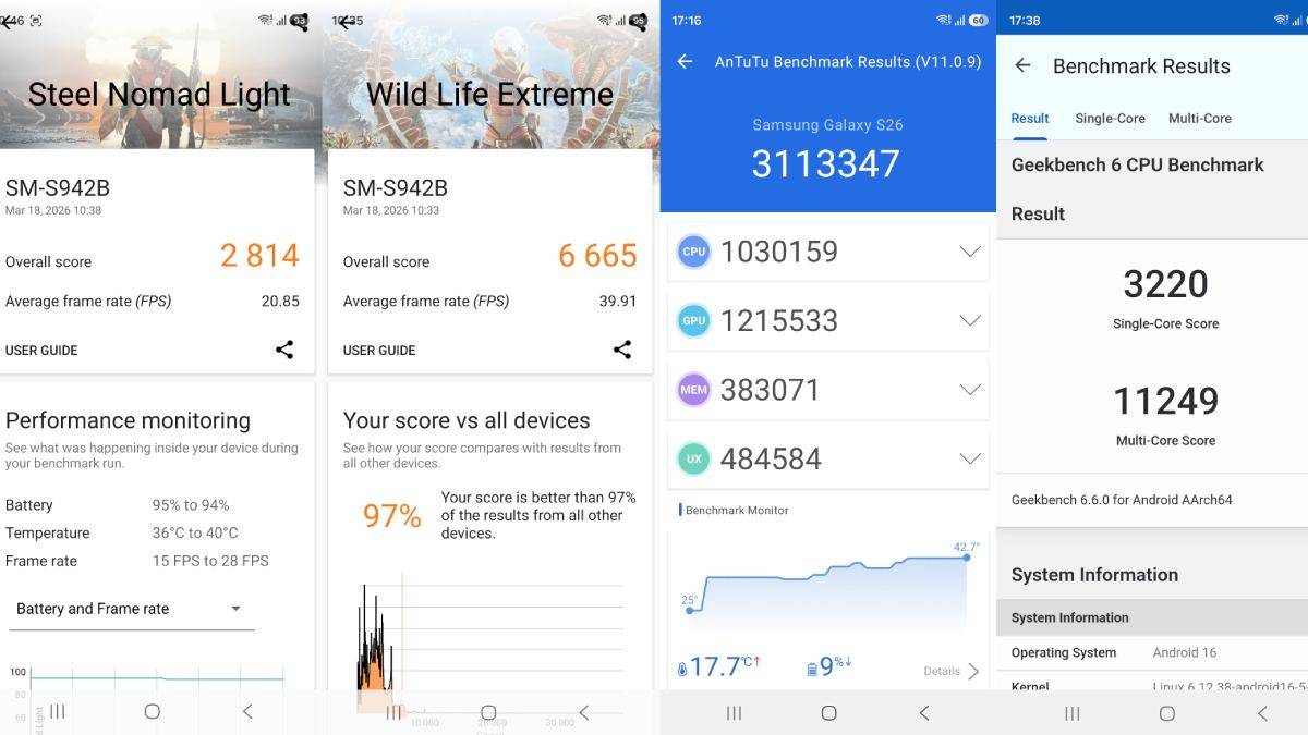 हमने इस फोन को Antutu बेंचमार्क पर टेस्ट किया, जहां Samsung Galaxy S26 ने 31,13,347 तक के स्कोर को टच किया। हालांकि इस सेगमेंट में मीडियाटेक डायमेंसिटी 9500 चिपसेट वाले फोन 36 लाख के आसपास स्कोर कर रहे थे, जबकि क्वालकॉम स्नैपड्रैगन 8 एलीट जेन 5 वाले फोन ने तो 39 लाख से ज्यादा का स्कोर किया। ऐसे में सैमसंग गैलेक्सी एस26 थोड़ा पीछे तो रह जाता है। परंतु इसकी तुलना अगर आप iPhone 17 से करते हैं, तो फिर यह डिवाइस बहुत आगे जाता है। iPhone 17 Antutu पर 22 लाख तक का स्कोर कर पाया था।