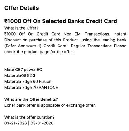 मोटोरोला जी57 पावर 14,999 रुपये में लॉन्च हुआ था। लेकिन इन दिनों कंपनी इसपर 1,000 रुपये का डिस्काउंट दे रही है। शॉपिंग साइट फ्लिपकार्ट सहित कंपनी वेबसाइट पर भी यह मोबाइल छूट के साथ खरीदा जा सकता है। यह ऑफर सीमित समय के लिए लाया गया है जिसका फायदा सिर्फ मार्च महीने में ही मिलेगा। फ्लिपकार्ट पर ICICI और Axis बैंक कार्ड से फोन खरीदने पर यह 1 हजार रुपये की छूट मिलेगी। वहीं कंपनी वेबसाइट पर HDFC और SBI कार्ड इस्तेमाल करने पर 1,000 रुपये का डिस्काउंट प्राप्त होगा।