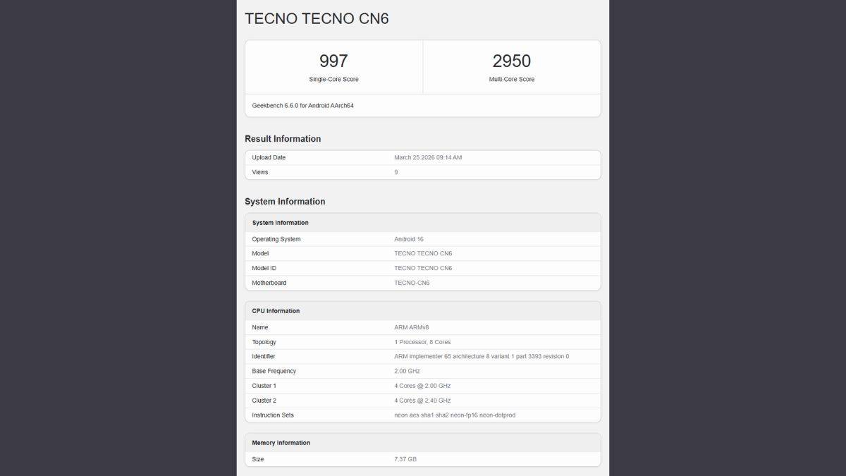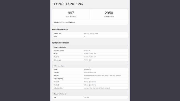 परफॉरमेंस स्कोर की बात करें तो Geekbench पर Tecno Camon Slim 5G डिवाइस ने सिंगल-कोर टेस्ट में 997 और मल्टी-कोर टेस्ट में 2,950 स्कोर हासिल किया है। लिस्टिंग में 8GB RAM का भी जिक्र है, जो मल्टीटास्किंग को स्मूद बनाए रखने में मदद कर सकता है। इसके अलावा यह फोन लेटेस्ट Android 16 पर रन कर सकता है, जिससे ग्राहकों को नए फीचर्स और बेहतर सिक्योरिटी अपडेट्स मिलेंगे।