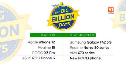 Flipkart Big Billion Days सेल के दौरान iPhone 12, iPhone SE, Motorola Edge 20, Edge 20 Fusion, Realme 8i, Google Pixel 4a, POCO X3 Pro, और ASUS ROG Phone 3 पर धमाकेदार डील मिल रही है। Flipkart सेल के दौरान Samsung Galaxy F62 स्मार्टफोन पर मिलने वाले डील को टीज कर रहा है। यह स्मार्टफोन फ्लिपकार्ट पर बेस्ट सेलिंग फोन है। इसके साथ ही फ्लिपकार्ट की सेल के दौरान Narzo 50 series, नया POCO फोन, Motorola, Samsung Galaxy F42, और OPPO-Vivo नए फोन लॉन्च करेंगे।