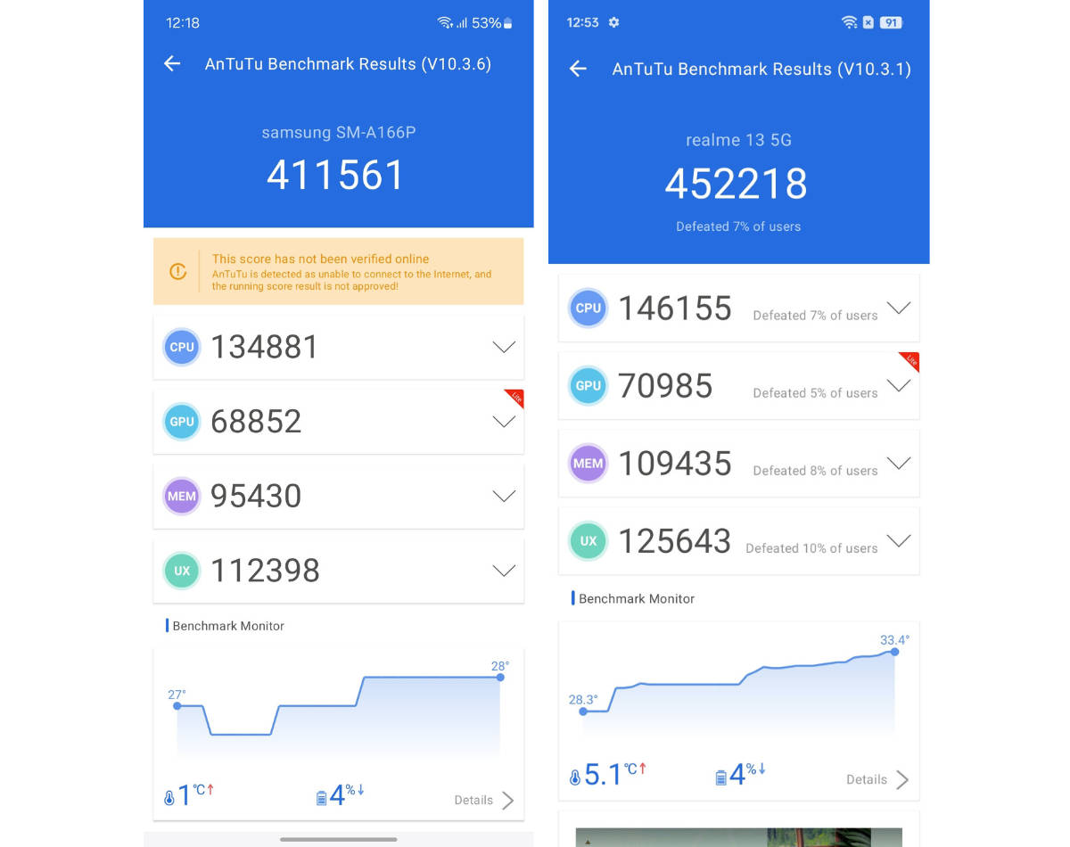 AnTuTu बेंचमार्क CPU, GPU, मेमोरी और उपयोगकर्ता अनुभव का आकलन करता है। इस टेस्ट में, Realme 13 ने Galaxy A16 पर काफी बढ़त दिखाई।