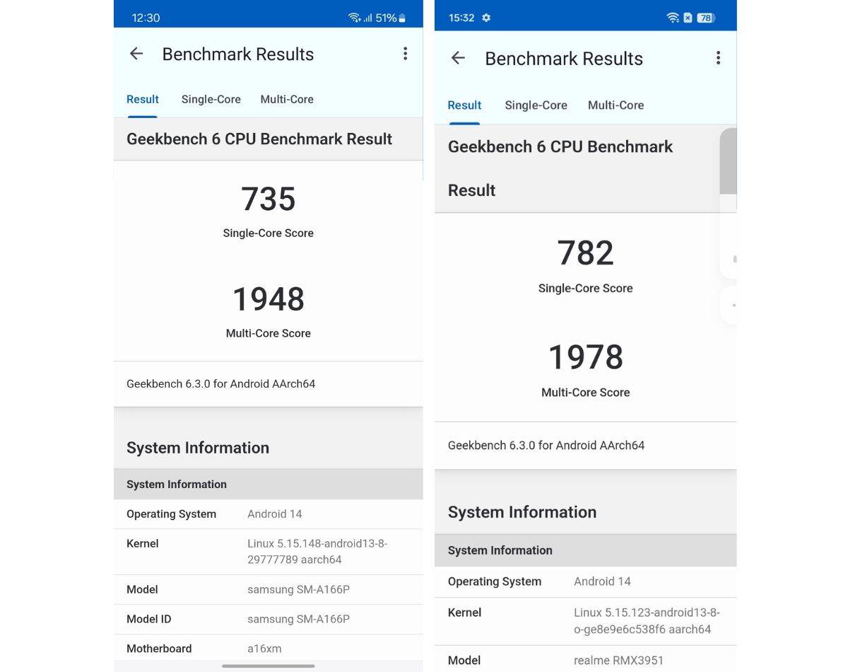 Realme 13 का चिपसेट Galaxy A16 की तुलना में थोड़ा बेहतर है, जो नीचे दिए गए स्कोर से भी स्पष्ट होता है। खास बात यह है कि Realme 13 ने सिंगल-कोर और मल्टी-कोर दोनों टेस्ट में बेहतर स्कोर किया। यहां आप खुद भी देख सकते हैं।