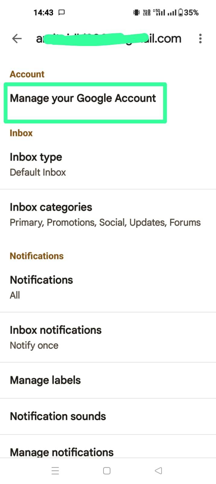 स्टेप-1: अपने एंड्रॉयड फोन में गूगल ऐप या जीमेल ऐप को ओपन करें। फिर सेटिंग्स में जाने के बाद Manage your Google Account पर जाएं।