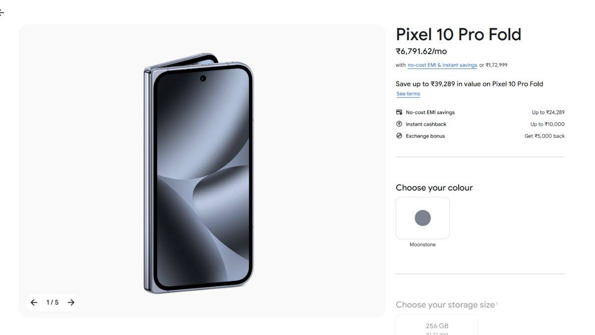 भारत में Google Pixel 10 Pro Fold की कीमत 1,72,999 रुपये रखी गई है। जिसमें 256GB इंटरनल स्टोरेज वाला सिंगल वैरियंट शामिल है। यह फोन फिलहाल सिर्फ Moonstone कलर में उपलब्ध है। इसे Google India ऑनलाइन स्टोर सहित अन्य ऑनलाइन और ऑफलाइन स्टोर्स से खरीदा जा सकता है।
