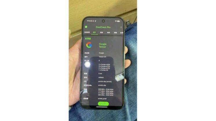 - डिवाइस पर DevCheck Pro ऐप चल रहा है, जिससे पता चलता है कि इसमें Tensor G5 प्रोसेसर मिलेगा। यह एक फ्लैगशिप चिप लगती है जिसमें एक Cortex X4 प्राइम कोर, तीन Cortex-A725 कोर, दो और Cortex-A725 कोर और दो Cortex-A520 एफिशिएंसी कोर हैं।