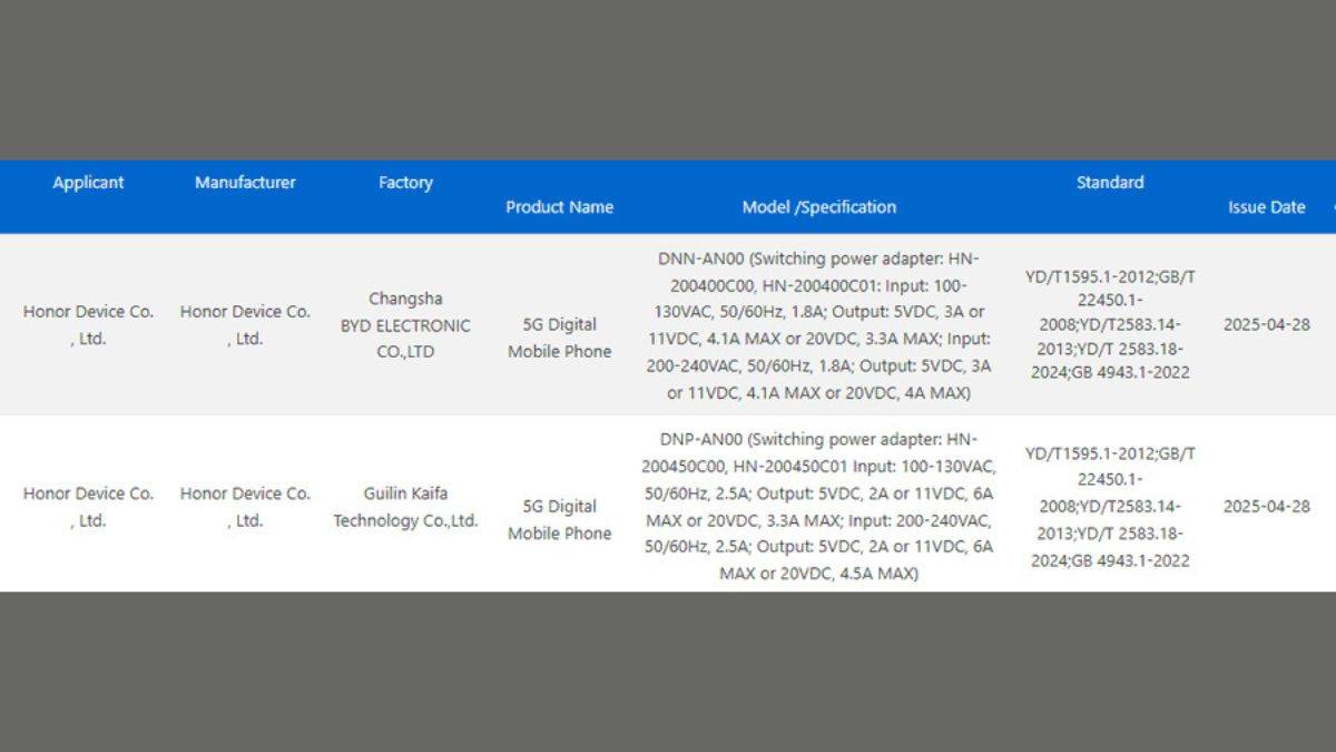 - DNP-AN00, यानी Honor 400 Pro, को 90W चार्जिंग सपोर्ट के साथ सर्टिफिकेशन मिला है, जो इसे फास्ट चार्जिंग सेगमेंट में और दमदार बनाता है।
