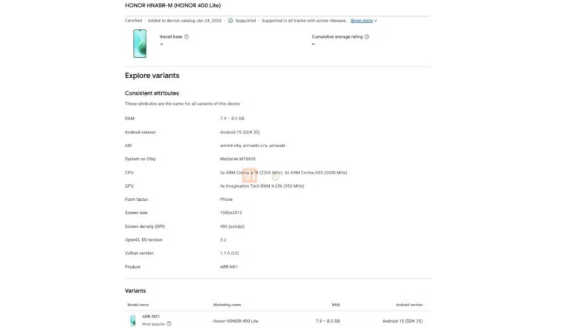 - Honor 400 Lite को Google Play Console पर मॉडल नंबर ABR-NX1 के साथ लिस्ट किया गया है।