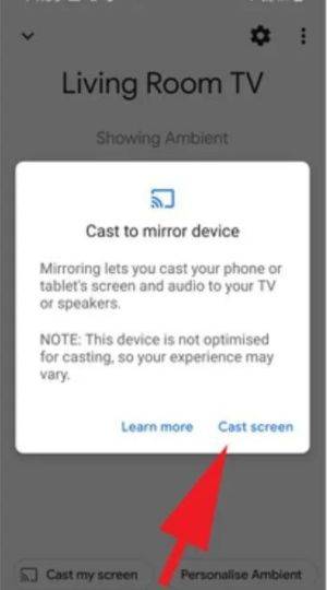स्टेप-4: कास्ट स्क्रीन पर टैप करने के बाद कास्ट स्क्रीन पर क्लिक करें। इसके बाद स्मार्टफोन की स्क्रीन टीवी पर दिखाई देने लगेगी।