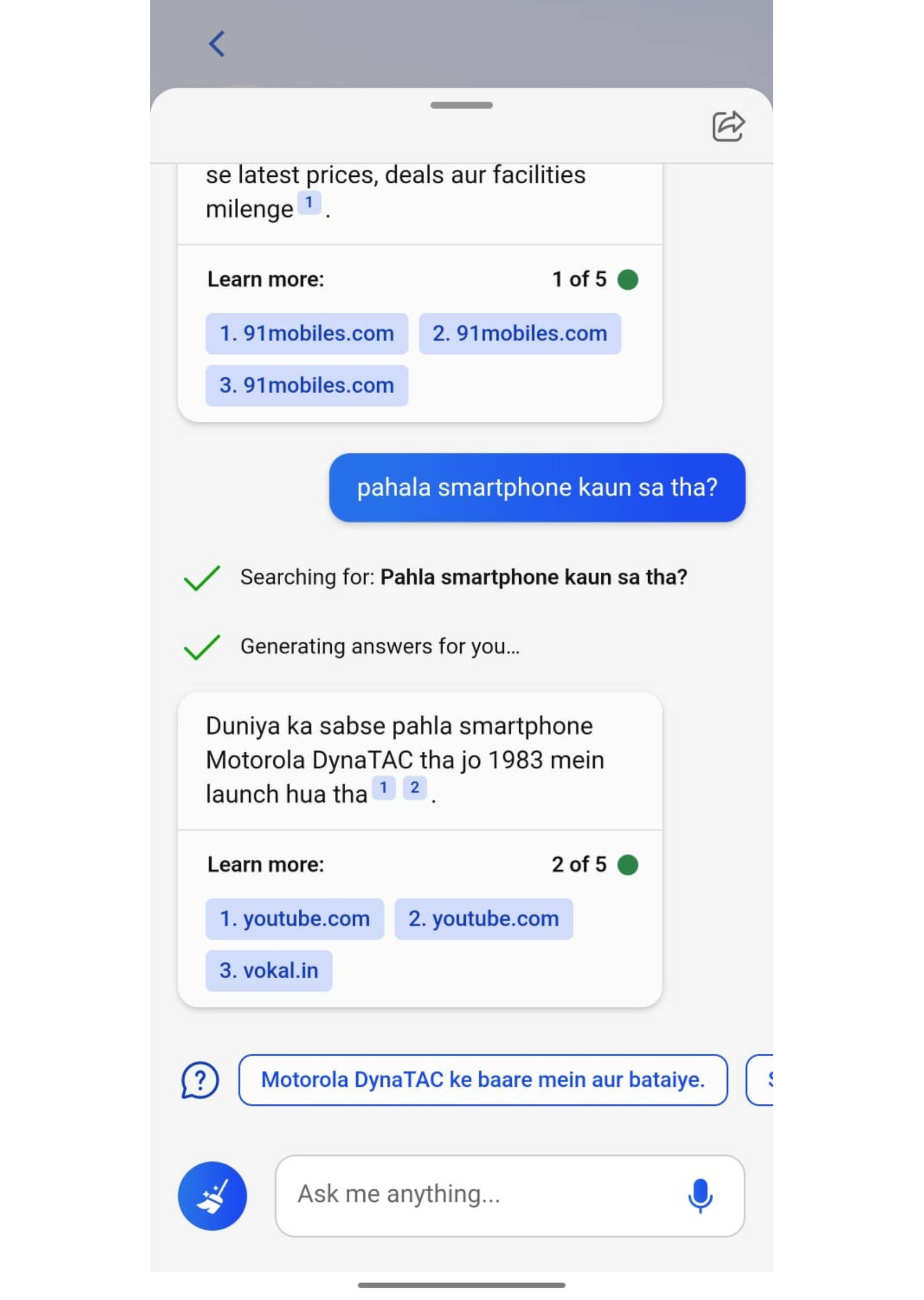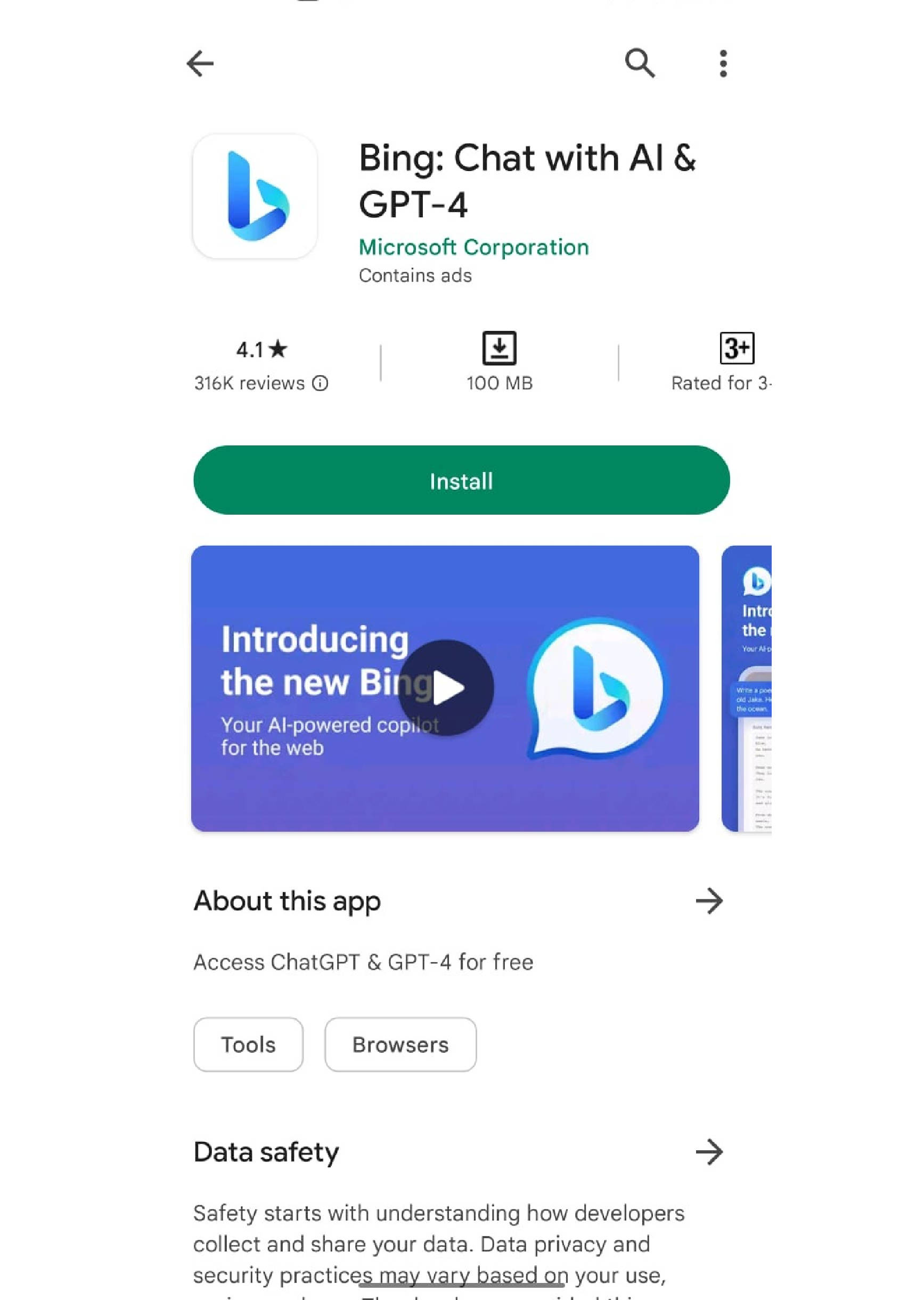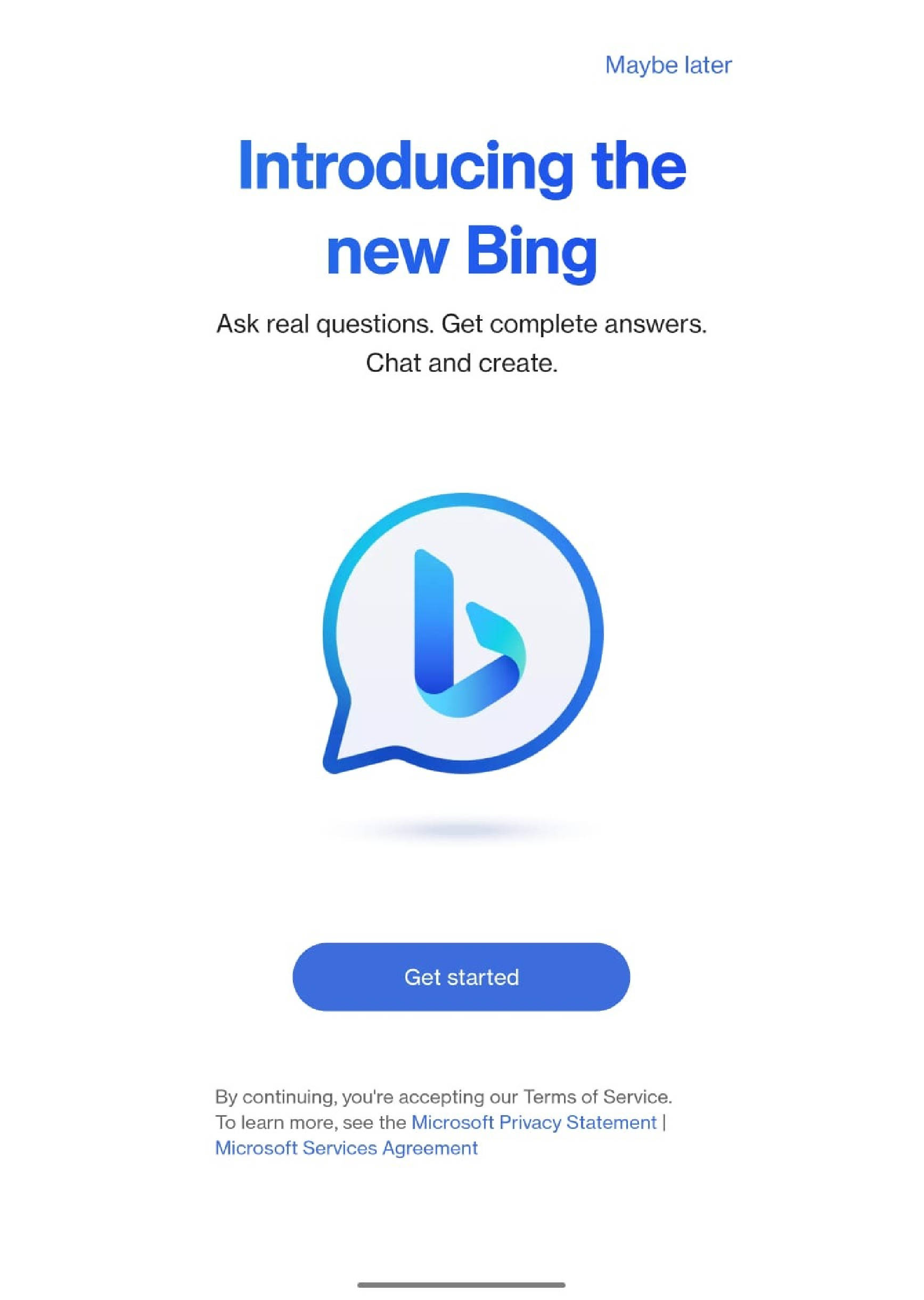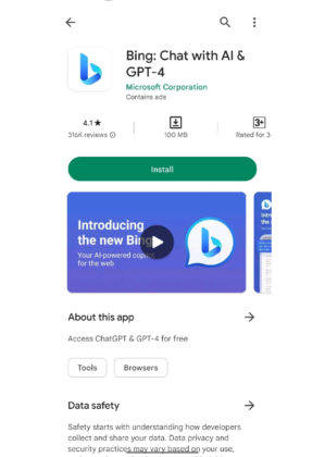 माइक्रोसॉफ्ट ने अपने मोबाइल ब्राउजर Bing Chat App में AI आधारित चैटबोट Bing Chat में इनेबल किया है। मोबाइल ब्राउजर Microsoft Bing को एंड्रॉयड यूजर्स को Google Play Store और iOS यूजर्स Apple App स्टोर से डाउलोड कर सकते हैं।