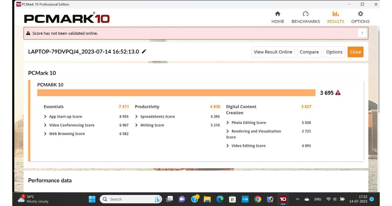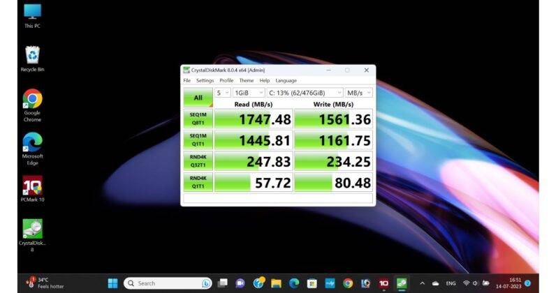लैपटॉप का असली परफॉर्मेंस जानने के लिए हमने इस पर कई बेंचमार्क टेस्ट किए, जिसका रिजल्ट मिलाजुला कहा जा सकता है। क्रिस्टल डिस्क मार्क पर यह लैपटॉप रीड स्पीड 1747.48 तक गया, जबकि राइट स्पीड 1,516.36 तक का रहा।
