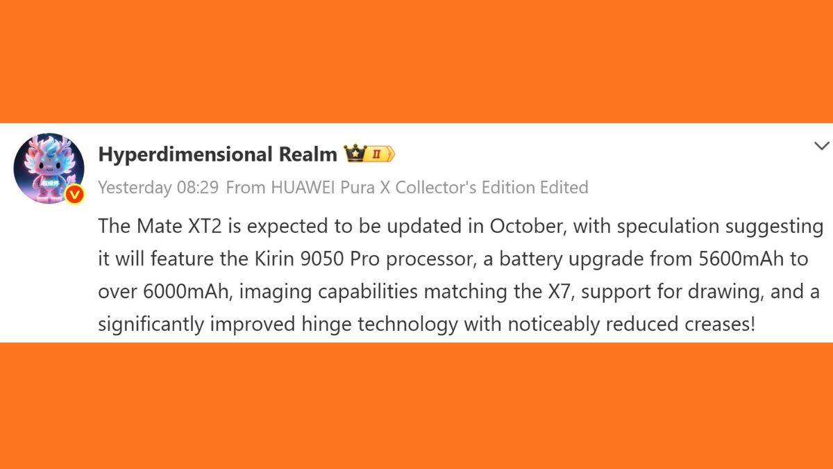 माइक्रो ब्लॉग्गिंग साइट वीबो पर टिप्स्टर Hyperdimensional Realm ने आगामी ट्राई-फोल्ड फोन की जानकारी दी है। बताया गया है कि Huawei Mate XT 2 को इस साल अक्टूबर में लॉन्च किया जा सकता है। खास बात यह है कि यह डिवाइस Huawei की अगली फ्लैगशिप सीरीज Huawei Mate 90 series के साथ चीन में एंट्री ले सकता है। यदि यह टाइमलाइन सही साबित होता है, तो कंपनी अपने पिछले ट्राई-फोल्ड मॉडल्स की तरह ही लॉन्च शेड्यूल का पैटर्न फॉलो कर सकती है।