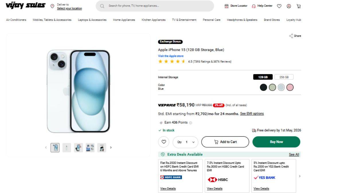 विजय सेल्स पर मिलने वाले बैंक ऑफर्स की बात करें, तो अभी फोन का 128GB वैरियंट सिर्फ 58,190 रुपये में मिल रहा है। HDFC Bank क्रेडिट कार्ड EMI पर 6 महीने या उससे ज्यादा अवधि के लिए 3,500 रुपये तक का इंस्टेंट डिस्काउंट मिल रहा है, जबकि 3 महीने की EMI पर 500 रुपये की छूट मिलती है। HSBC कार्ड पर 7.5% तक (3,000 रुपये तक) की छूट, Yes Bank पर 5% (2,500 रुपये तक) और Bank of Baroda कार्ड पर 10% (3,000 रुपये तक) का इंस्टेंट डिस्काउंट मिल रहा है।