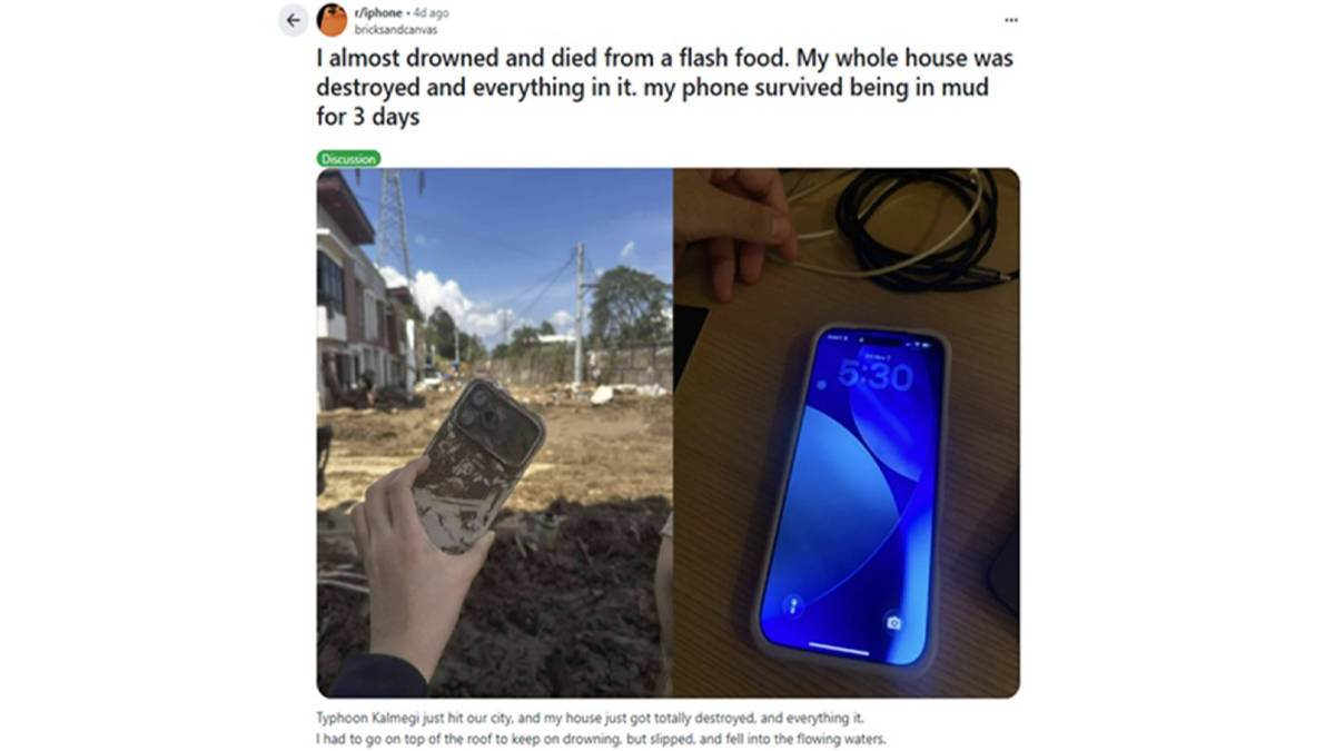 iPhone 17 Pro सर्वाइवल की घटना सोशल प्लेटफॉर्म Reddit पर शेयर की गई है। bricksandcanvas यूजर प्रोफाइल पर यह पोस्ट अपलोड हुई है जिसे पूरा वाकया बताया गया है। बीते दिनों पूर्वी एशिया में कलमेगी तूफान का कहर बरपा था। फिलिपिंस में भी इस तूफान ने तबाही मचाई जिसकी चपेट में आईफोन यूजर का शहर भी आया। यूजर के अनुसार उसका घर बाढ की चपेट में आया था और सारा सामान भी पानी में डूब गया था। इस सामान में उसका iPhone 17 Pro भी शामिल था।