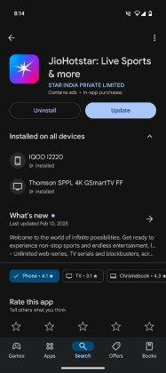आज सुबह हमने स्पॉट किया कि मोबाइल पर पहले से डाउनलोड Hotstar को प्लेस्टोर से अपडेट करने पर उसका नाम व लोगो दोनों बदल रहा है। अपडेट करने के बाद फोन पर Hotstar का नाम और बदलकर हुआ JioStar हो गया। हालांकि, जब हमने चेक किया तो अभी भी जियोसिनेमा ऐप पहले की तरह ही फोन पर अपने कंटेंट के साथ मौजूद है और उसमें कोई बदलाव नहीं हुआ है।