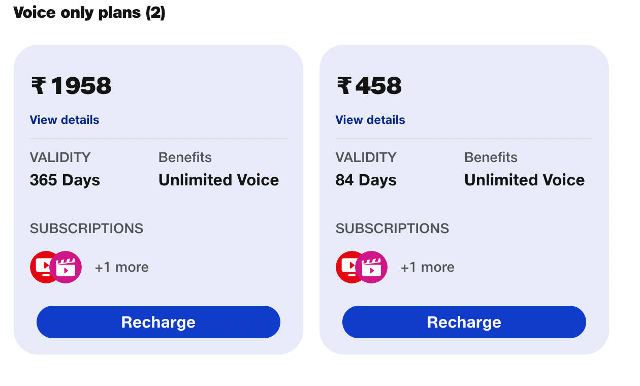 जैसा कि हमने आपको पहले बताया कि रिलायंस जियो ने इन प्लान्स को केवल वॉयस कॉलिंग और एसएमएस की जरूरतों पर केंद्रित किया है। यह उन यूजर्स के लिए आदर्श हैं जो इंटरनेट डाटा की बजाय केवल बेसिक कॉलिंग व एसएमएस सेवाओं का उपयोग करना पसंद करते हैं। कंपनी ने ₹458 और ₹1,958 की कीमत में वॉयस-ओनली प्लान उतारे हैं।