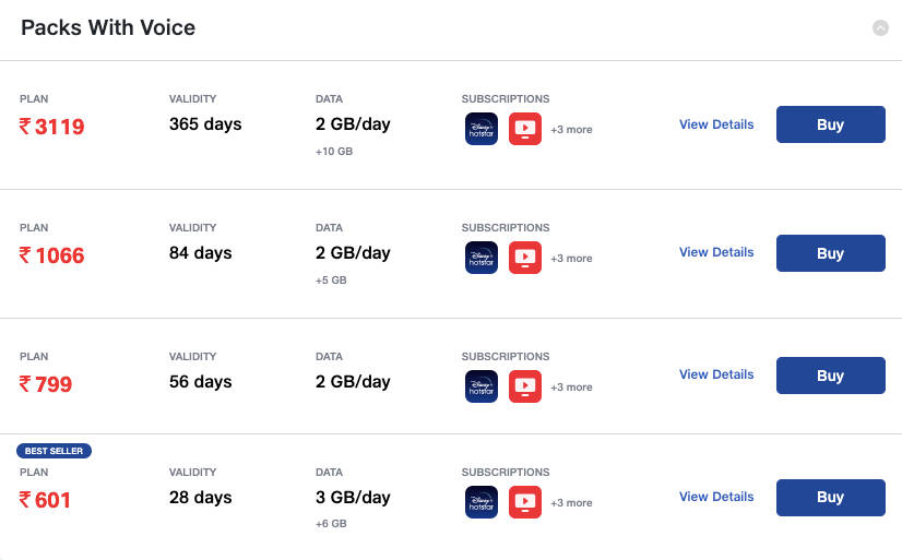 | Rs 3,119 | Rs 2,599 | 2GB/day, 10GB data, voice calls, 100 SMS per day | 365 days |