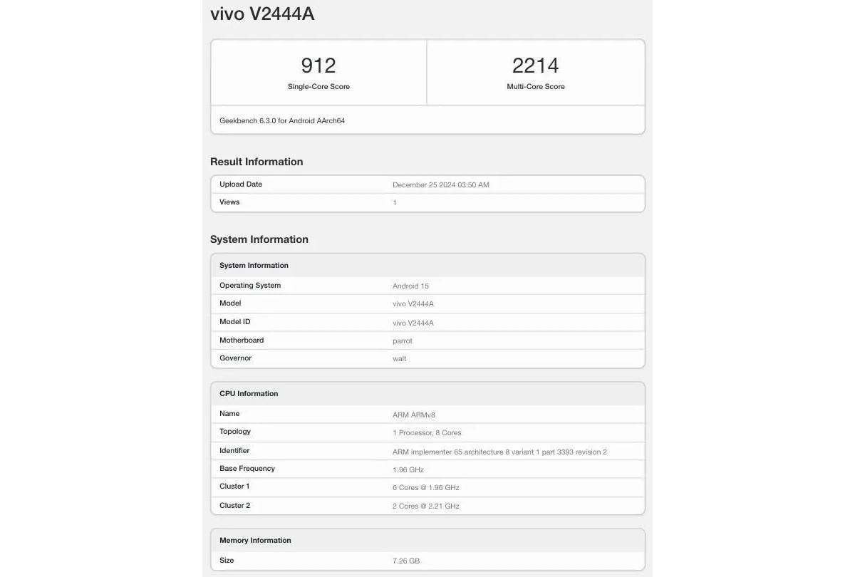 - यह स्मार्टफोन Vivo V2444A मॉडल नंबर के साथ गीकबेंच पर लिस्ट हुआ है।
