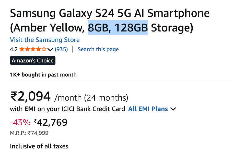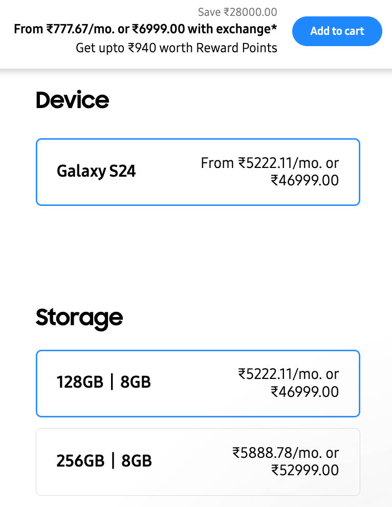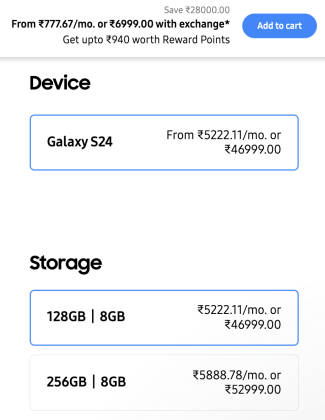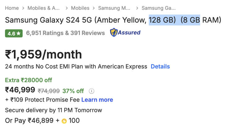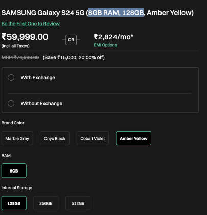 | Samsung Galaxy S24 | 8GB RAM + 128GB Storage प्राइस |