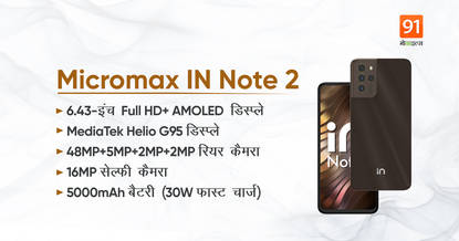 Micromax ने भारत में Micromax IN Note 2 स्मार्टफोन को लॉन्च कर दिया है। माइक्रोमैक्स का यह लेटेस्ट स्मार्टफोन पिछले साल लॉन्च किए IN Note 1 का सक्सेसर है। Micromax के लेटेस्ट स्मार्टफोन को देखकर लगता है कि कंपनी ने इस फोन को Samsung Galaxy S21 सीरीज के डिजाइन से प्रेरित होकर किया है। लेटेस्ट In Note 2 स्मार्टफोन को AMOLED डिस्प्ले और क्वाड रियर कैमरा सेटअप के साथ पेश किया है। यहां हम आपको Micromax IN Note 2 स्मार्टफोन की स्पेसिफिकेशन्स, फीचर्स और कीमत के बारे में डिटेल में जानकारी दे रहे हैं।