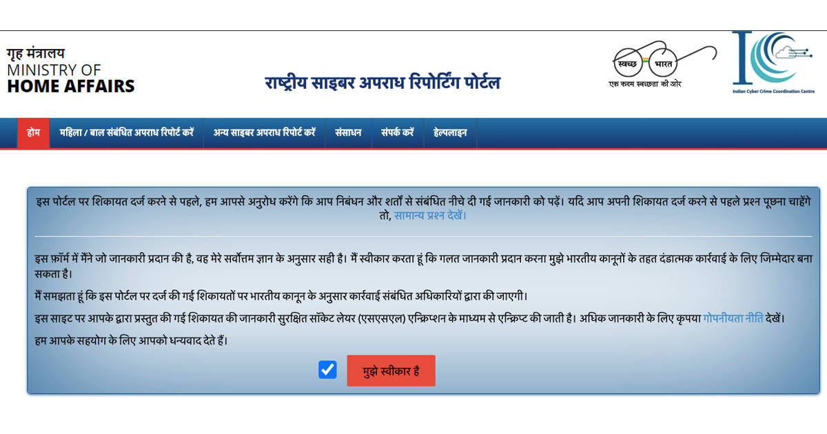 1. सबसे पहले राष्ट्रीय साइबर अपराध रिपोर्टिंग पोर्टल की ऑफिशियल वेबसाइट पर जाएं, जो हिन्दी और अंग्रेजी दोनों भाषाओं में हैं। इसके लिए cybercrime.gov.in पर क्लिक करें।