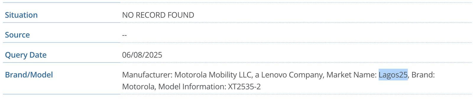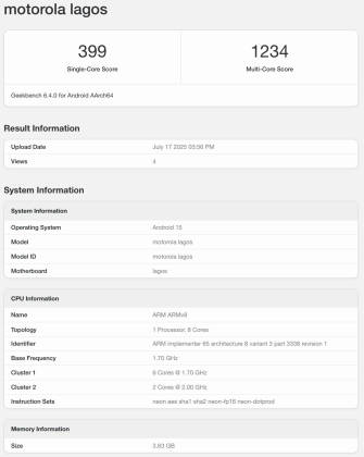 हाल में यह फोन IMEI डेटाबेस में आया था, जहां से पता चलता है कि मोटो G06 का कोडनेम Lagos है। यह डिवाइस Geekbench के डेटाबेस में मोटोरोला लागोस नाम से ही लिस्ट हुआ है। गौरतलब है कि गीकबेंच प्रोसेसर बेंचमार्क ऐप है, जो प्रोसेसर की सिंगल और मल्टीकोर क्षमता टेस्ट कर स्कोर देता है। इस गीकबेंच के सिंगल कोर टेस्ट में मोटो जी06 399 तक का स्कोर कर पाया, जबकि मल्टी-कोर टेस्ट में यह फोन 1234 अंक हासिल करने में सक्षम रहा। बजट फोन के लिहाज से यही स्कोर ठीक-ठाक कहा जा सकता है।