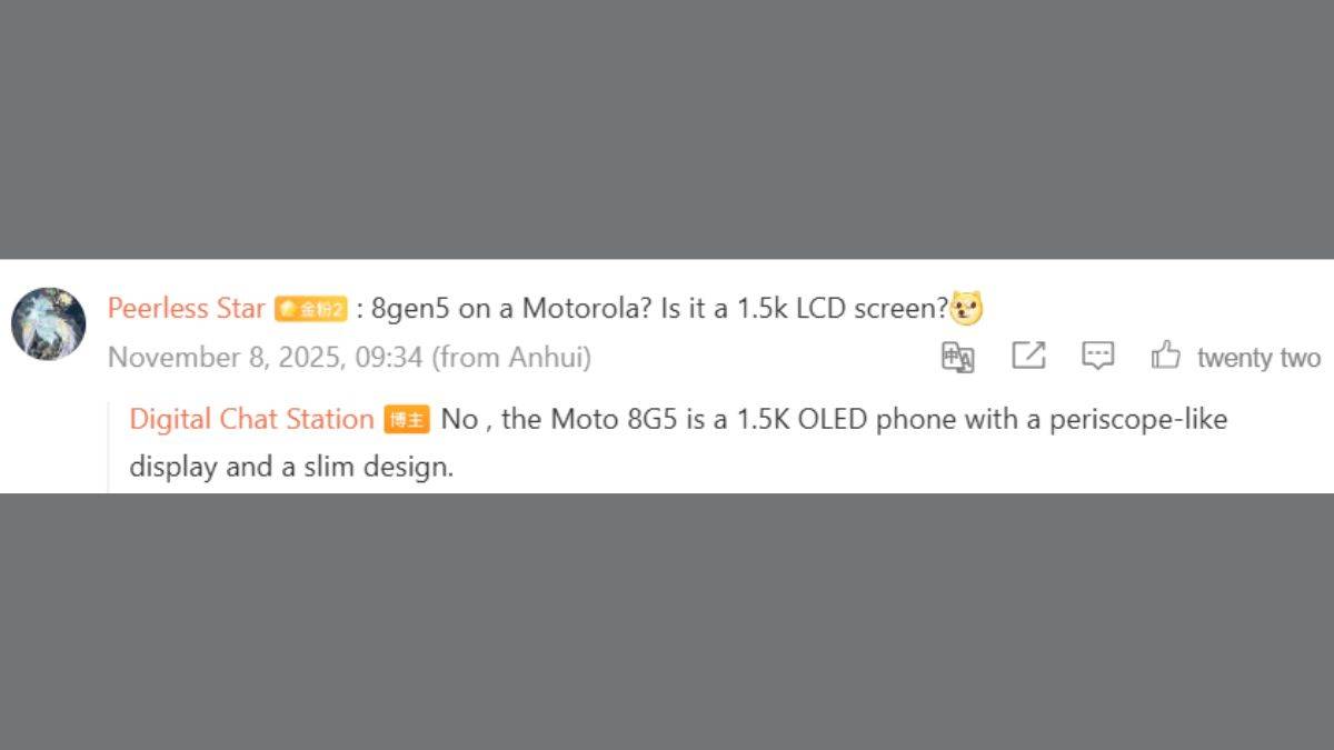 क्वालकॉम इस महीने के अंत तक अपना अगला फ्लैगशिप प्रोसेसर Snapdragon 8 Gen 5 लॉन्च कर सकता है। इसी बीच खबर है कि Motorola इस चिपसेट से लैस स्मार्टफोन लेकर आ सकता है। जिसे Motorola Edge 70 Ultra नाम से एंट्री मिल सकती है। इसकी जानकारी टिप्स्टर डिजिटल चैट स्टेशन ने फोन का नाम लिए बिना शेयर की है। आइए, आगे आपको लेटेस्ट लीक में सामने आए स्पेसिफिकेशंस विस्तार से बताते हैं।