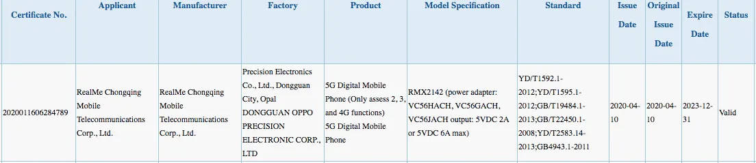 MySmartPrice की रिपोर्ट के अनुसार Realme स्मार्टफोन को मॉडल नंबर RMX2142 के साथ चाइनीज सर्टिफिकेशन साइट 3C के साथ MIIT सर्टिफिकेशन वेबसाइट पर देखा गया है। दोनों ही लिस्टिंग में मॉडल नंबर RMX2142 को 5G सपोर्ट के साथ स्पॉट किया गया है। वहीं, 3C लिस्टिंग में सामने आया है कि फोन में 30W फास्ट चार्जिंग का सपोर्ट होगा। हालांकि, MIIT सर्टिफिकेशन पर इस बात की जानकारी नहीं दी गई है। इसे भी पढ़ें: लॉकडाउन के तुरंत बाद Realme TV हो सकता है इंडिया में लॉन्च, अहम जानकारी आई सामने