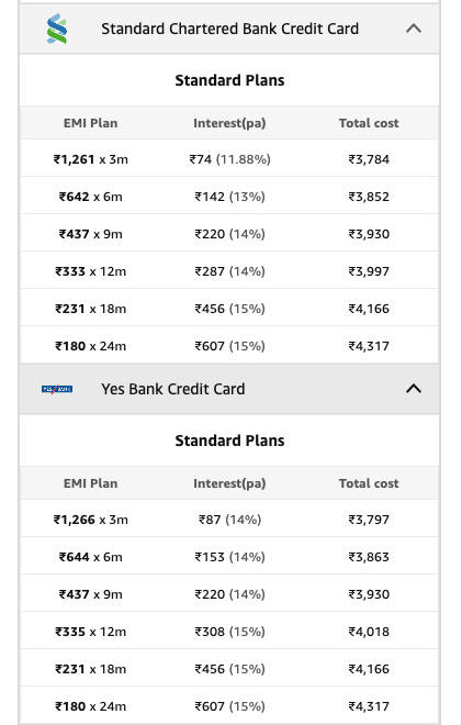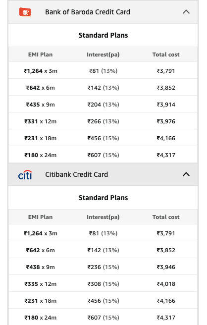 अगर आप अमेजन पे ICICI बैंक क्रेडिट कार्ड से फोन खरीदते हैं तो 618 रुपये की 6 EMI या 1237 रुपये की 3 EMI पर इसे खरीदा जा सकता है। वहीं, Bajaj Finserv के कार्ड से 1237 रुपये की 3 EMI पर इसे खरीदा जा सकता है।