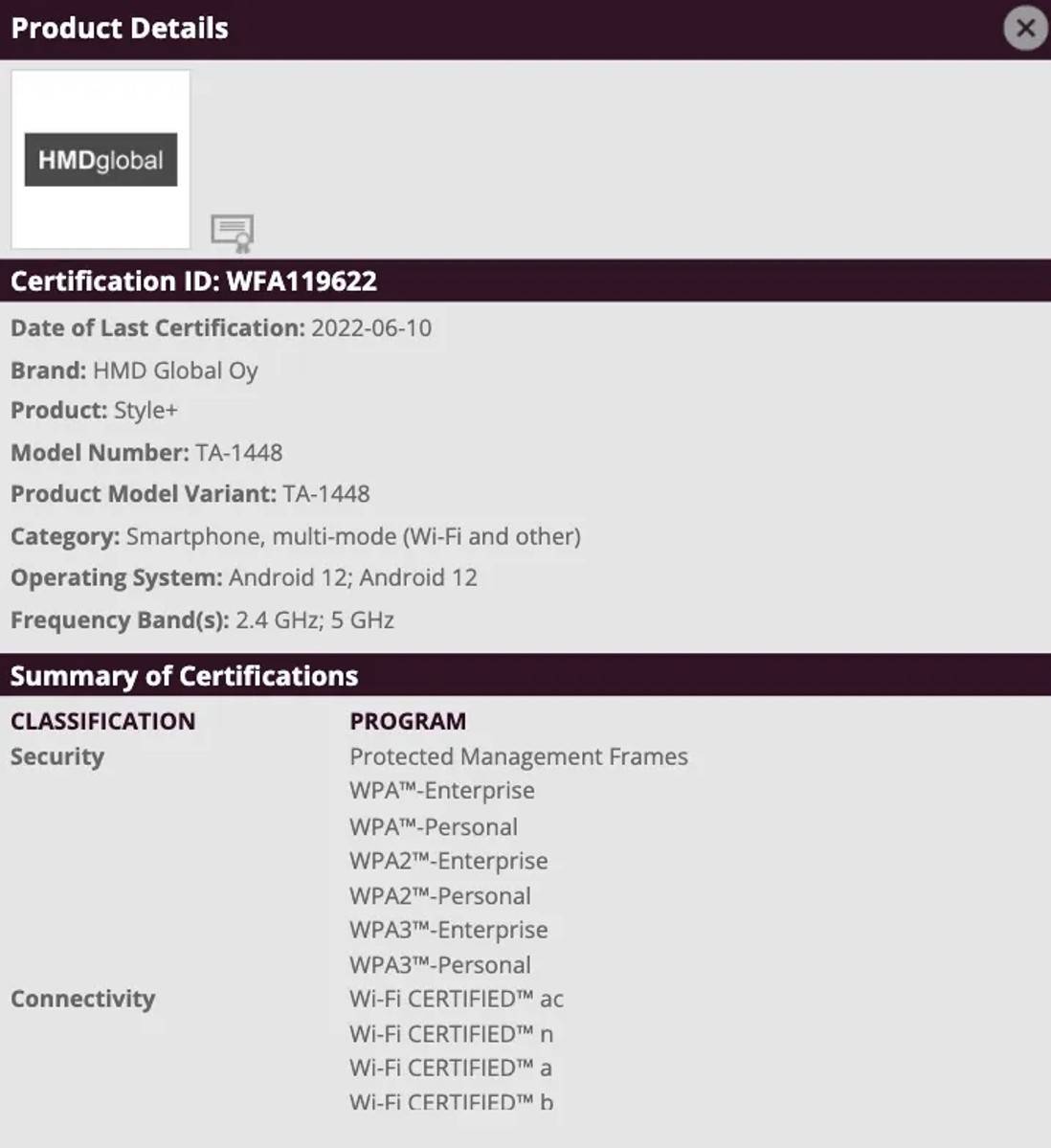 Nokia Style+ स्मार्टफोन भी जल्द ही लॉन्च हो सकता है। नोकिया का यह फोन मॉडल नंबर TA-1448 के साथ कई सर्टिफिकेशन वेबसाइट पर लिस्ट किया गया है। WiFi Alliance की लिस्टिंग से पता चलता है कि यह फोन 2.4GHz और 5GHz नेटवर्क सपोर्ट करता है। नोकिया का यह फोन लेटेस्ट Android 12 पर रन करेगा। इसके साथ ही चाइना क्वालिटी सर्टिफिकेशन से पता चलता है कि Nokia Style+ स्मार्टफोन 20W फ़ास्ट चार्ज सपोर्ट करेगा।