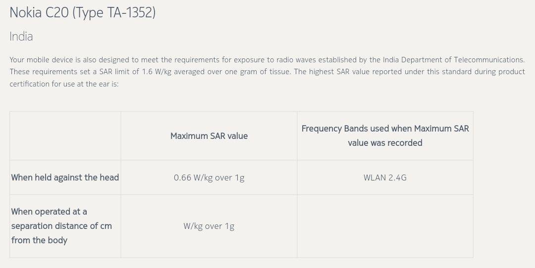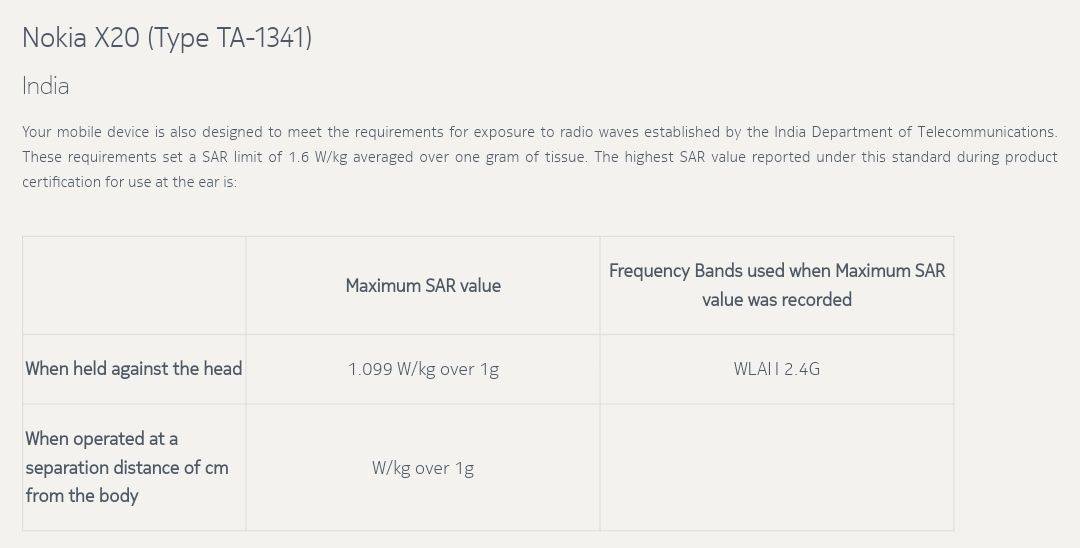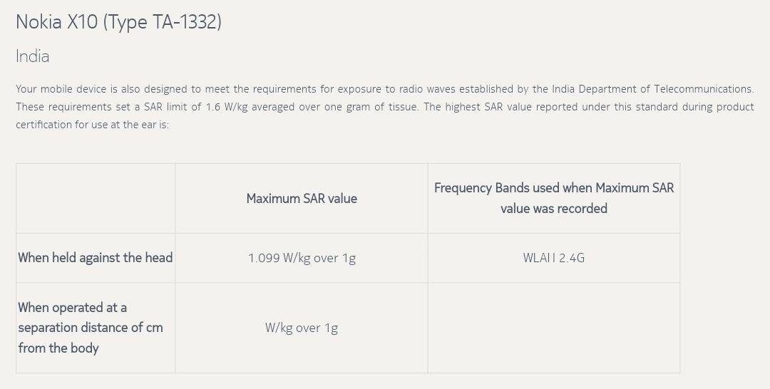 Nokia की इंडियन वेबसाइट पर Nokia X10, X20 लिस्टिंग को सबसे पहले टेक वेबसाइट NokiaMob द्वारा स्पॉट किया गया था। एसएआर सेक्शन में इन हैंडसेट्स के उल्लेख के साथ, हम सुरक्षित रूप से यह मान सकते हैं कि नोकिया भारत में नई एक्स-सीरीज़, जी-सीरीज़ और सी-सीरीज़ स्मार्टफोन्स को लॉन्च करने की तैयारी कर रहा है। नोकिया की वेबसाइट पर एसएआर सेक्शन में अब तक केवल भारत में लॉन्च होने वाले फोन को ही लिस्ट किया गया है। इसे भी पढ़ें: Nokia 110 4G और Nokia 105 4G शानदार नए डिजाइन और 4G VoLTE कनेक्टिविटी के साथ हुए लॉन्च