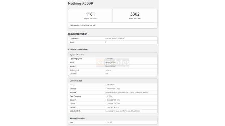 - गीकबेंच पर Nothing स्मार्टफोन का मॉडल नंबर A059P है। यहां ‘P’ का मतलब हो सकता है कि यह Nothing Phone (3a) Pro से जुड़ा है, क्योंकि TDRA सर्टिफिकेशन के अनुसार, Phone (3a) का मॉडल नंबर A059 है।