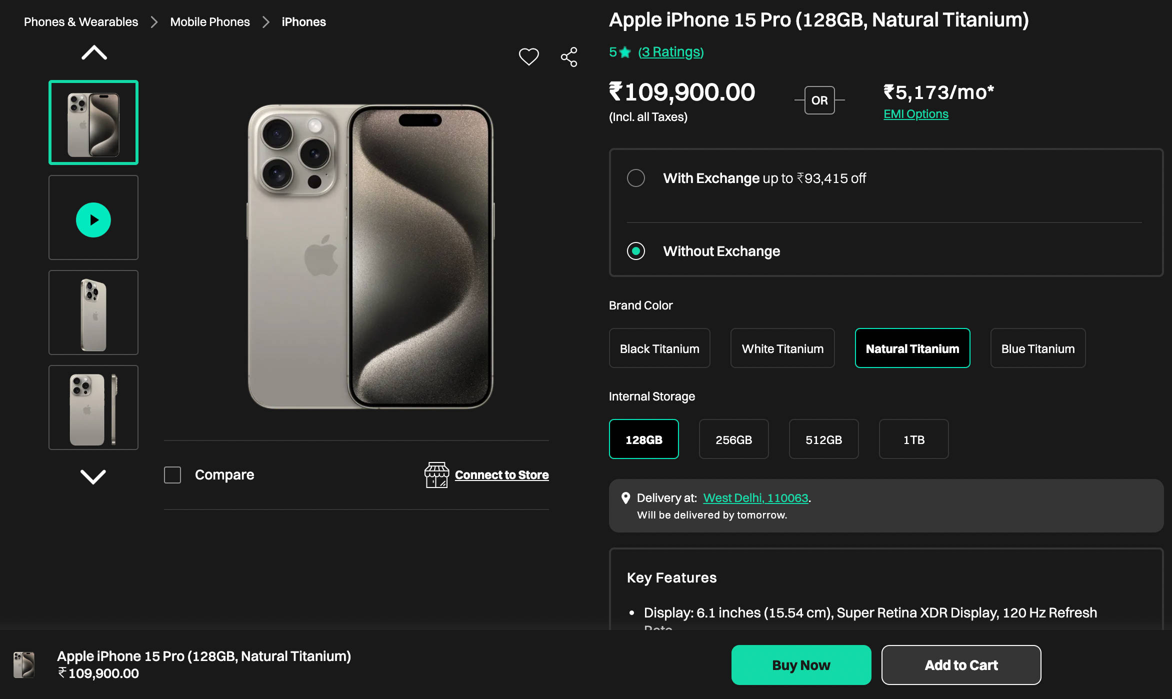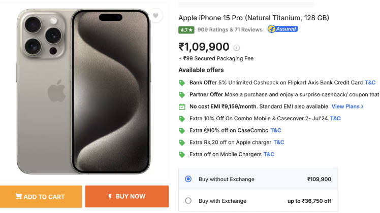 Reliance Digital पर यह फोन 1,09,900 रुपये में बिक रहा है। बैंक क्रेडिट कार्ड से ईएमआई बनवाने पर 7.5 प्रतिशत का इंस्टेंट डिस्काउंट मिलेगा जो 8242.5 रुपये के करीब है। इस छूट के बाद iPhone 15 Pro का रेट 1,01,658 रुपये के करीब पड़ेगा। आईफोन 15 प्रो को डील के साथ खरीदने या इसकी फुल डिटेल जानने के लिए (यहां क्लिक करें)