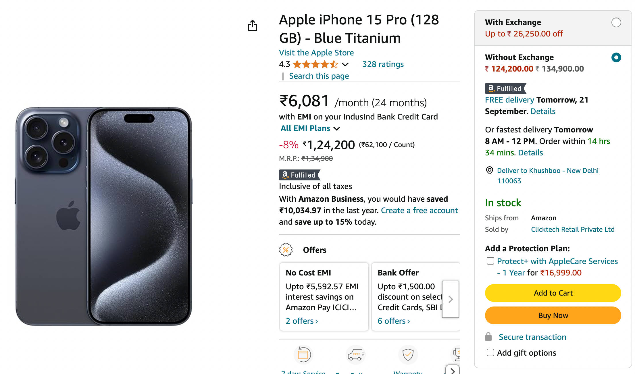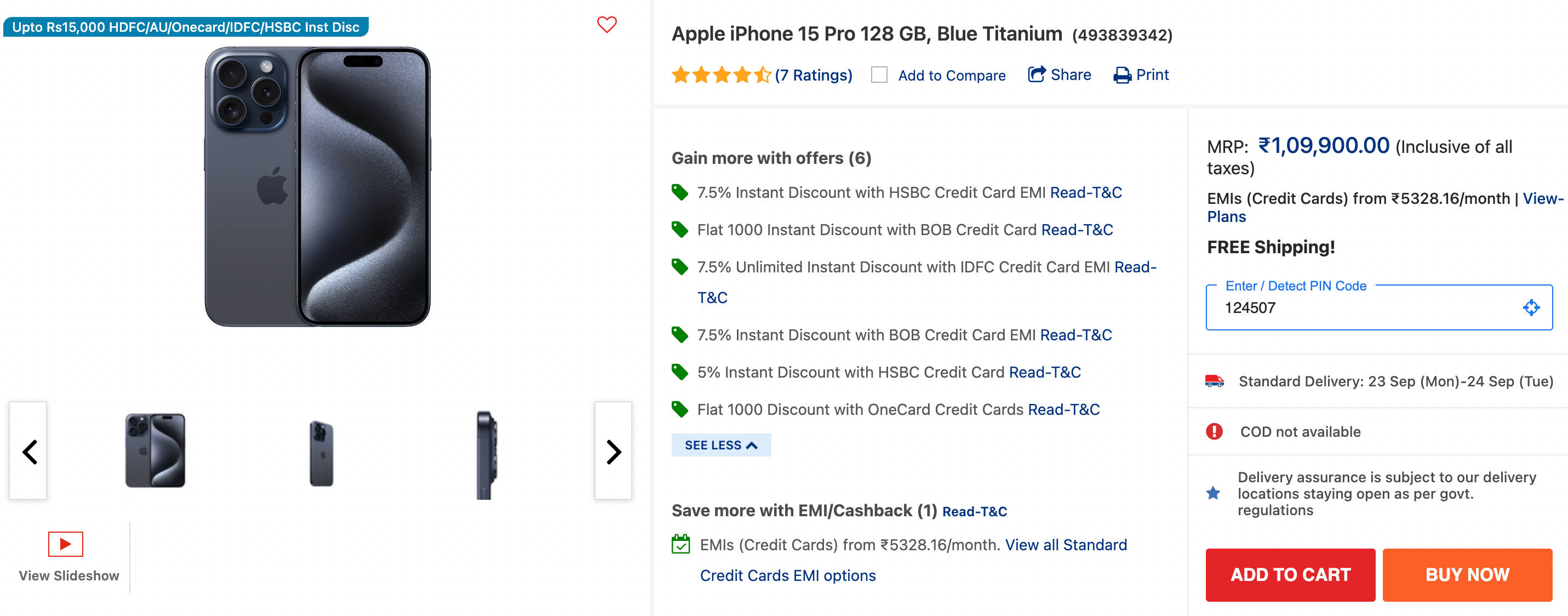 विभिन्न शॉपिंग साइट्स आईफोन 15 प्रो को प्राइस ड्रॉप के साथ बेच रही हैं। इनपर बैंक ऑफर्स भी मिल रहे हैं जिनमें प्राइवेट व सरकारी बैंक के क्रेडिट कार्ड तथा डेबिट कार्ड पर कैशबैक दिया जा रहा है। सबसे ज्यादा ऑफर बेनिफिट हमें मुकेश अंबानी के रिलायंस डिजिटल पर प्राप्त हो रहा है। HSBC और IDFC बैंक ग्राहक अगर इस फोन को अपने Credit Card से EMI पर खरीदते हैं तो उन्हें एक्स्ट्रा 7.5% Instant Discount दिया जाएगा।